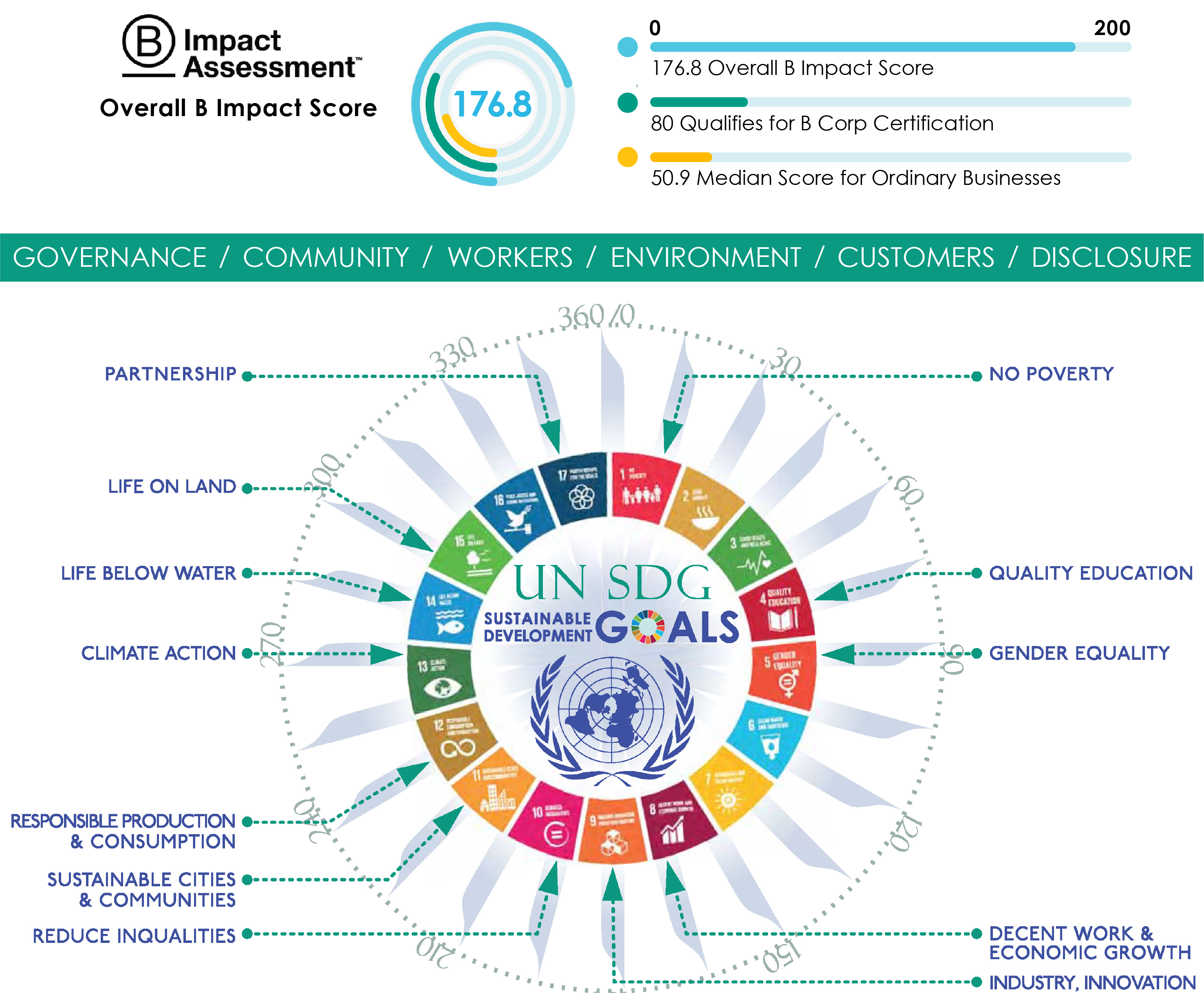 This achievement reflects our unwavering commitment to 360° sustainability from the outset, ensuring that every decision we make prioritises both people and the planet. We actively contribute to 12 of the 17 UN Sustainable Development Goals and continuously push the boundaries of responsible business.